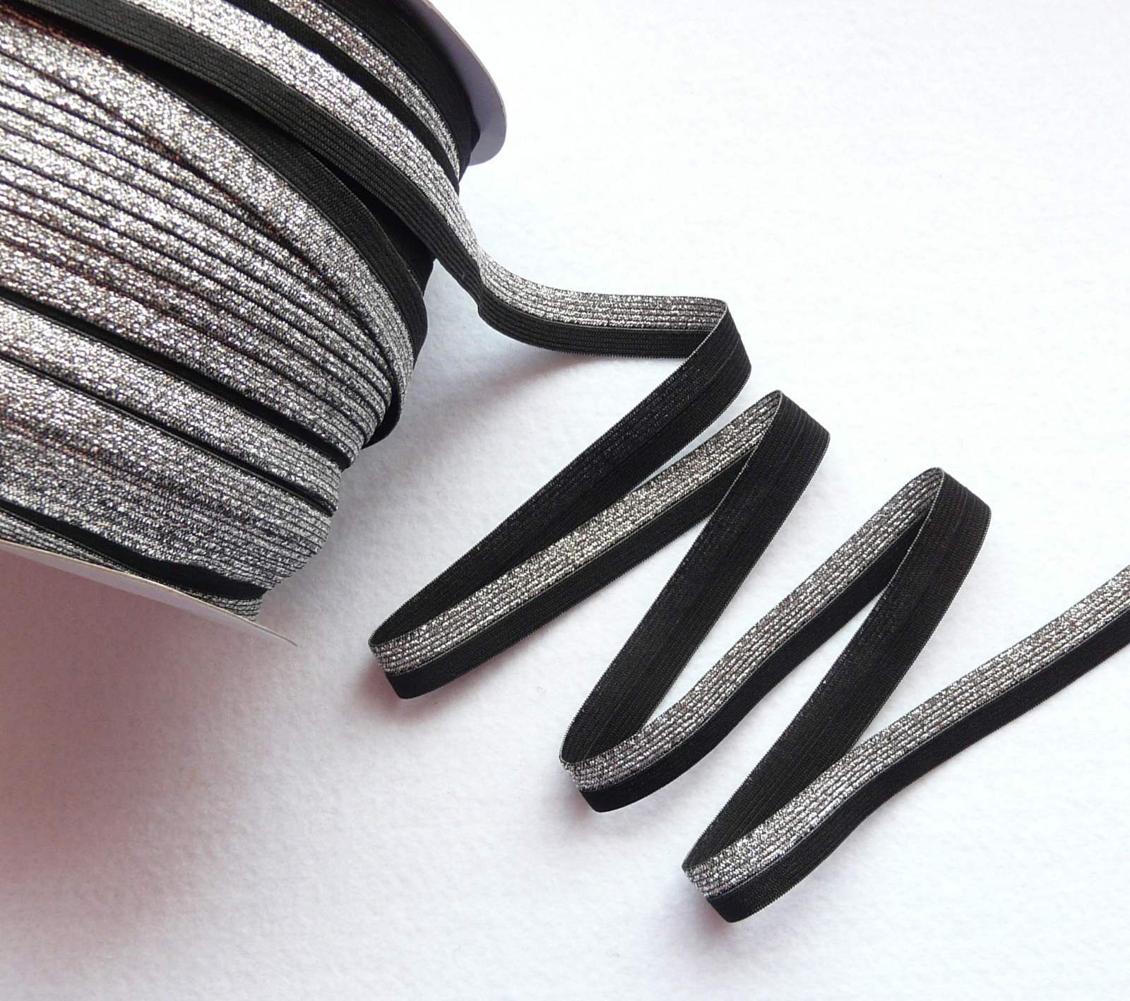 Бейка трикотажная (эластичная, 1,5см). Серебро, люрекс на черном