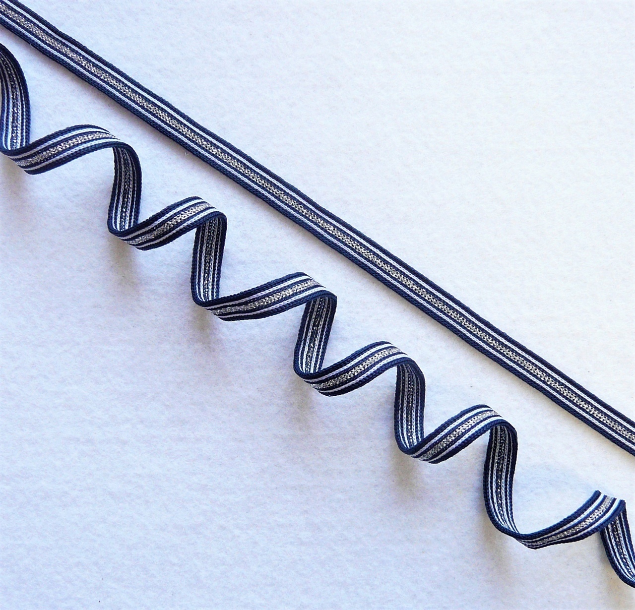 Лампасная лента (трикотажный, люрекс, 1,0 см). Т.синий/белый/серебро, ВО
